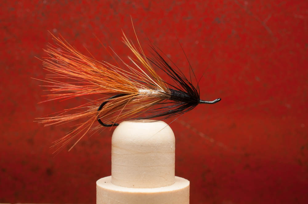 Another of my Formula 1 salmon flies. this one very much like the well known Apache pattern, just tied with golden pheasant and black hackle.